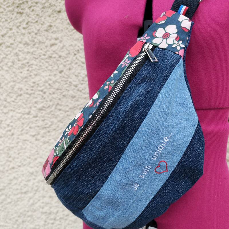 Le sac banane upcyclé est né de jeans qui ont déjà vécu. Transformé avec soin, il devient un accessoire tendance, moderne, pratique et durable. Chaque modèle est unique avec des nuances différentes de jean et une touche de fantaisie avec du motif. Les mots brodés ajoutent un côté poétique et unique.